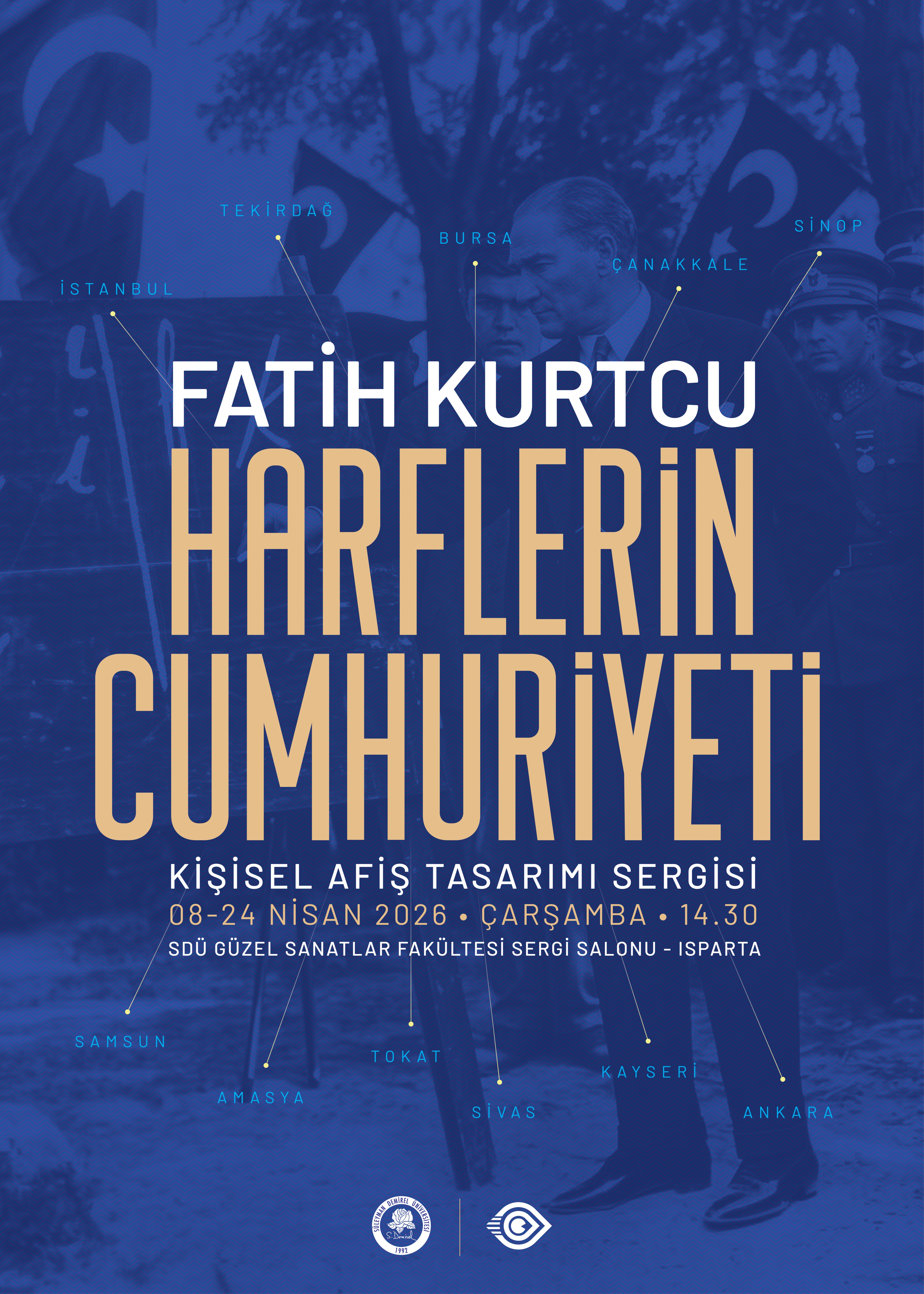 Fatih Kurtcu'nun Harflerin Cumhuriyeti Kişisel Afiş Tasarımı Sergisi 08 Nisan 2026 tarihinde Çarşamba günü 14.30'da SDÜ Güzel Sanatlar Fakültesi Sergi Salonunda açılacaktır.
